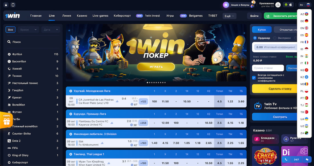 Платформа доступна игрокам и беттерам по всему миру. Официальный сайт 1Win поддерживает несколько языков, включая английский, русский, украинский, узбекский, казахский и азербайджанский. Дизайн сайта современный, выполнен в тёмных тонах с бело-голубыми акцентами, что делает навигацию комфортной. Панель управления интуитивна и включает основные разделы: